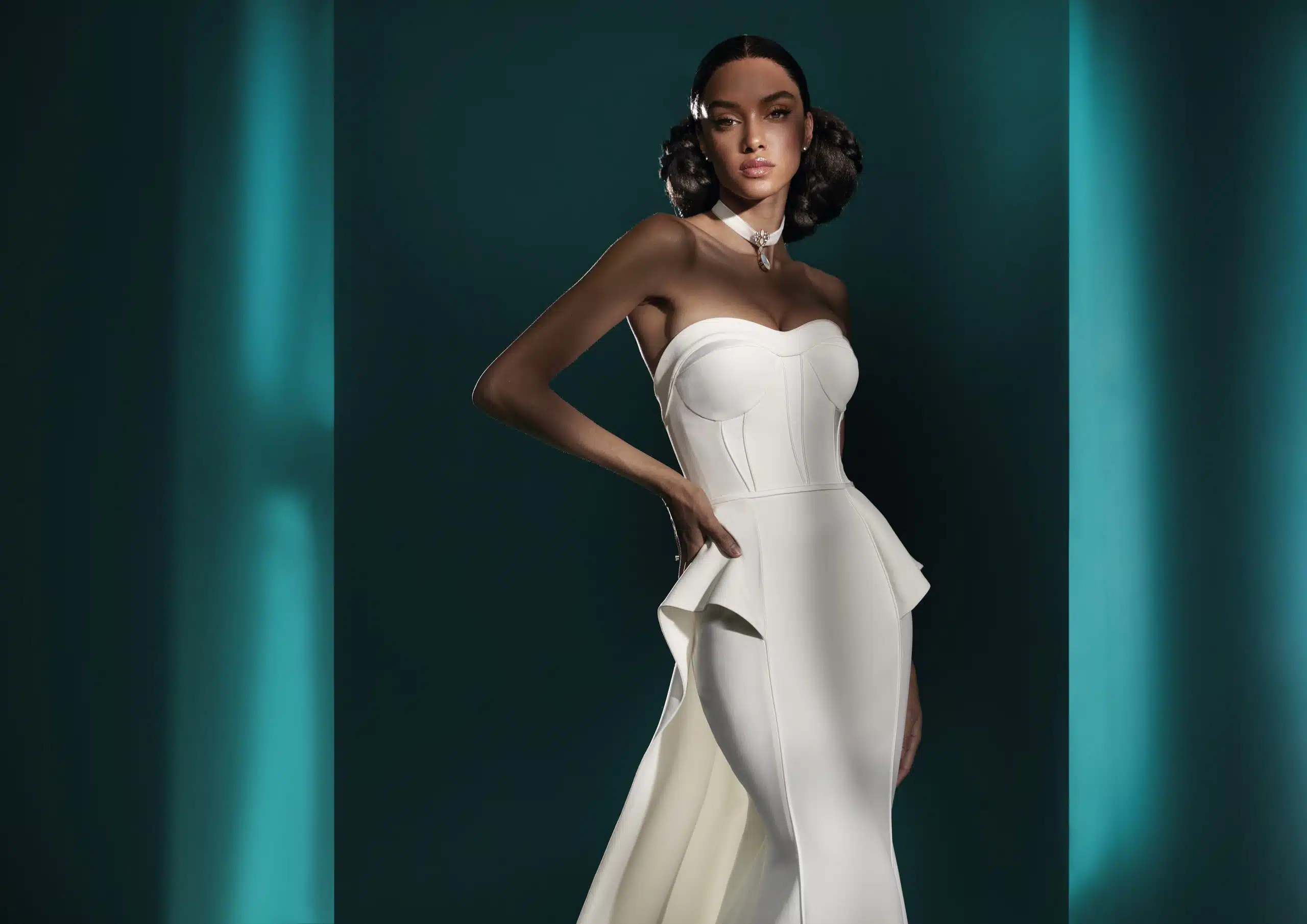 This elegant crepe mermaid dress features a unique sweetheart neckline bodice and stylish satin accented seams. The asymmetrical peplum skirt adds a sophisticated and feminine touch, creating a voluminous effect.