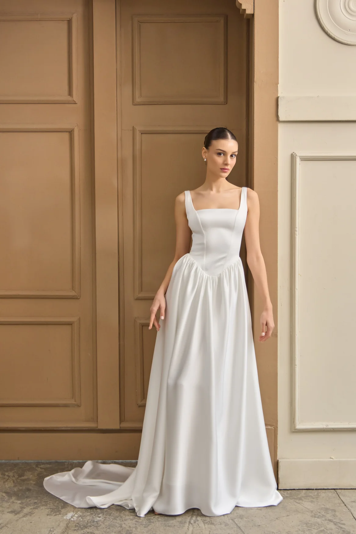 The Avelisse square neck bridal dress exudes modern elegance with a structured corset bodice, flowing A-line silhouette, and delicate draping for an effortlessly refined look.