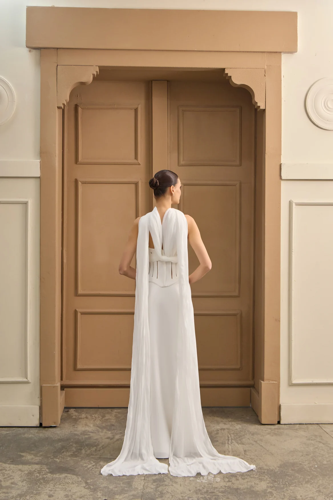 A striking corset-skirt wedding dress with a sculpted strapless bodice, structured boning, and a flowing column skirt. Dramatic scarf accents add ethereal movement for a regal, modern bridal look.