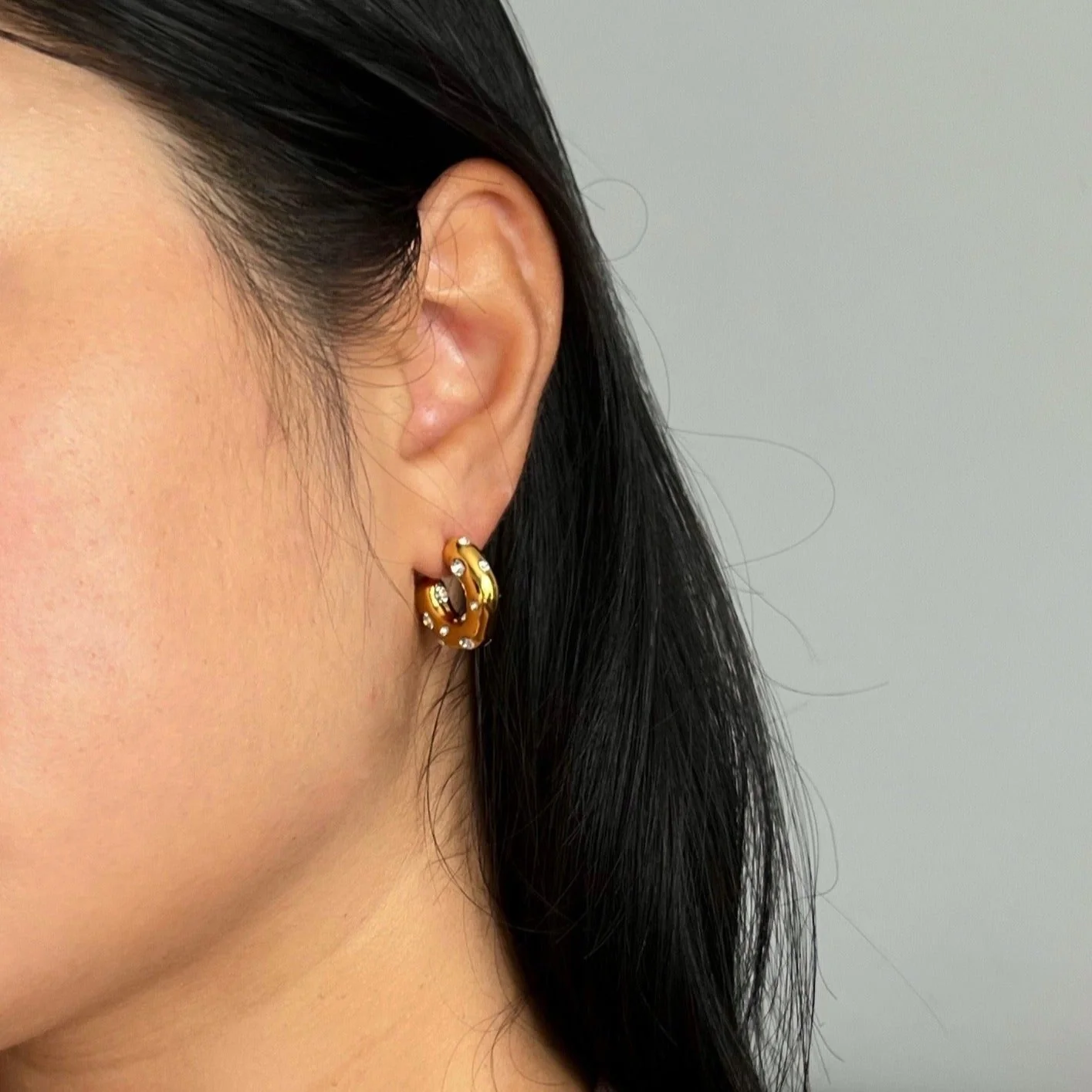 Sparkle, sparkle. These edgy hoops feature CZ stones of different sizes. Small hoops with a lot of sass. Perfectly paired when dressing up for a special occasion or a fun night out!