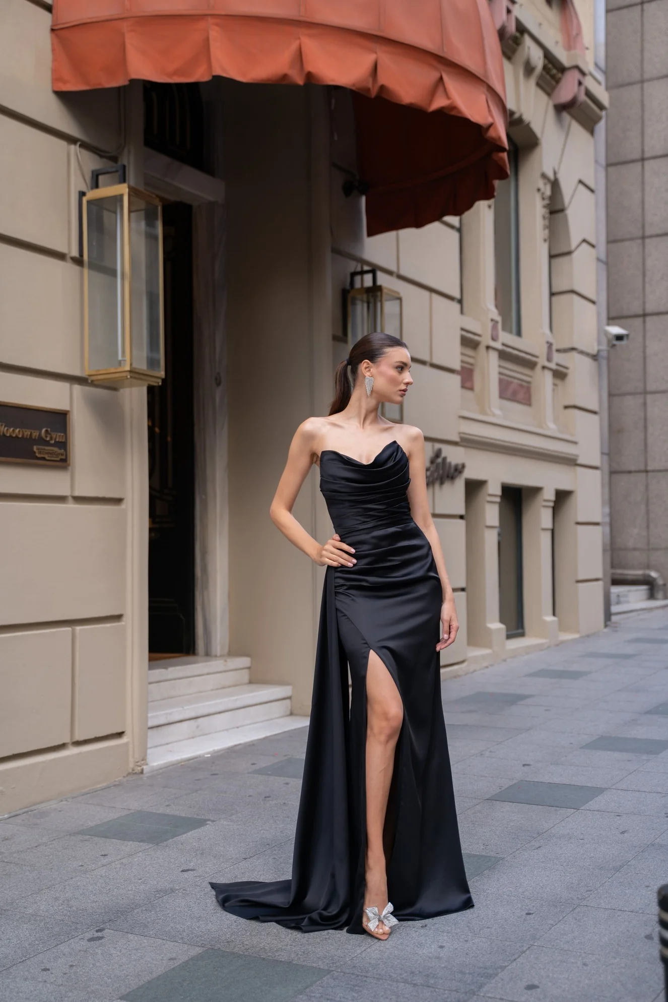 The Paulette gown exudes modern sophistication with its maxi column silhouette, cowl neckline, and thigh-high slit. Made from recycled satin stretch fabric, it features a corseted bodice for shaping, full lining for comfort, and a hidden back zipper for a seamless finish.