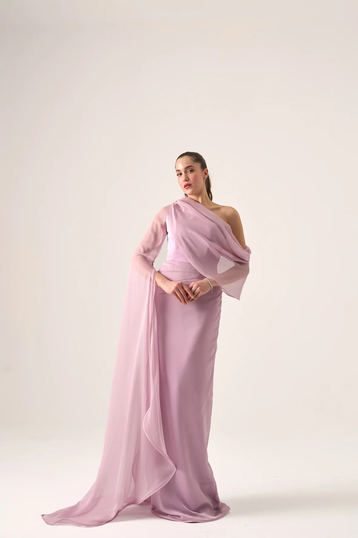 The Pemma gown features an elegant column silhouette with an asymmetric neckline and an off-shoulder draped sleeve design. This maxi-length gown offers a refined fit, perfect for sophisticated events and formal occasions.
